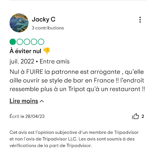 Read moreNous nous sentons dans l'obligation de répondre à votre message... Nous n'avons agresser personne... Nous avons simplement fait une remarque et votre serveuse nous a clairement dit que nous avions raison et qu'il fallait absolument parler avec " la patronne française" ce sont ses mots ! Donc personne n'a pleurer ni menacer en tout cas de notre coté, par ailleurs j'affirme et je confirme que nous vous avons demander a plusieurs reprises le livre des réclamation "obligation de le présenter au clients" s'il en fait la demande et a notre grande stupéfaction vous ne nous l'avez jamais transmis...ce qui prouve votre mauvaise gestion d'une entreprise. Depuis nous vivons très bien merci, nous avons simplement donner notre avis car Google nous a fait la demande...