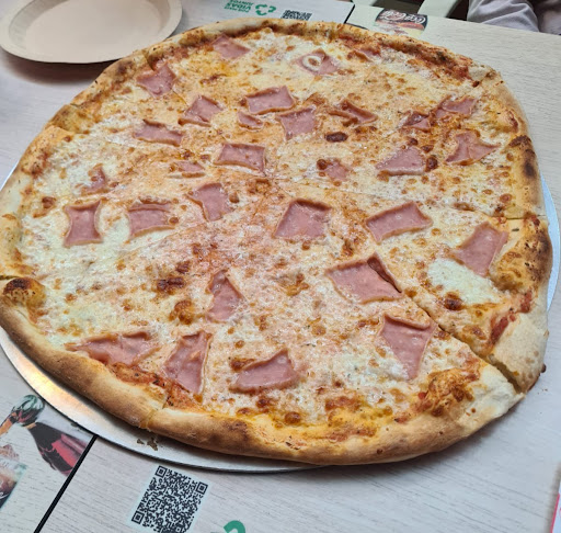 Huge good value pizzas - maxi large ones enough to feed a family. We got take away as staying nearby but there are tables & benches to eat in (but high so not if you have children or disabilities) but outside normal height tables & chairs to eat at. Lots of choice on the menu of pizzas & different size pizzas. We asked for sone toppings not to be on our pizza choice & was listened to & this was done & also for it to be cooked a bit longer so the dough base was more brown & again they happily did this for us. Husband had a bottle of beer happily while waiting for the pizza took about 15mins to prepare. Also can get deliveries by calling the store or on food apps. Menu on wall & on board outside in English as well...