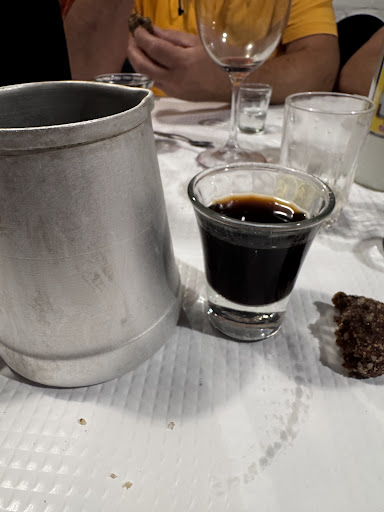 Sobremesas: -Queijo de figo decente; -Bolo seco, e desinteressante, de amêndoa; -Digestivos self service, abafadinho e aguardente; -Café solúvel deslavado;