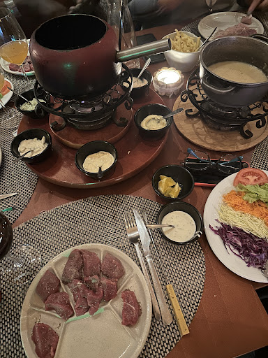 Optamos pelo fondue de carne, que chegou à mesa com uma seleção variada de molhos. No entanto, apesar da diversidade, poucos molhos realmente encantaram o paladar. Destacamos o de abacate e o de queijo como os mais interessantes, mas, no geral, faltou intensidade e autenticidade nos sabores – o que seria fundamental para elevar o prato. Para acompanhar, pedimos também também o fondue de queijo, na esperança de encontrar uma cremosidade e um sabor que trouxessem uma experiência mais memorável, para juntar com o fondue de carne mas Infelizmente, o queijo deixou a desejar; sua qualidade não atingiu as expectativas de um fondue excepcional.