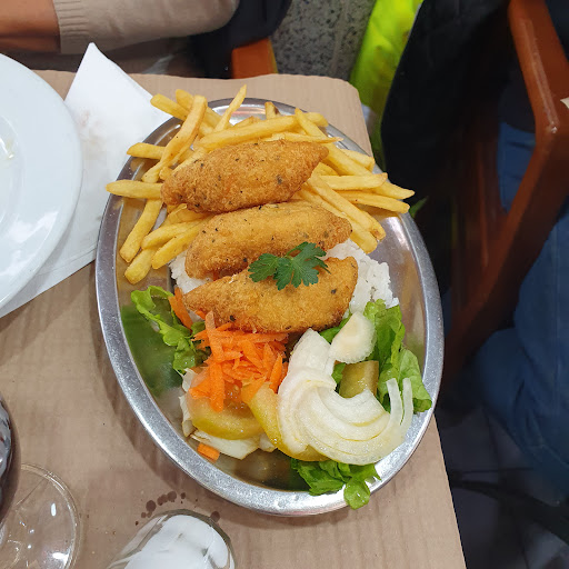 3.5 stars. Inexpensive, neighborhood, diner-type place. Simple, utilitarian, furniture and décor. Walls covered with local event posters and lottery advertising. Full bar with counter seating for eating, drinking, and buying scratch tickets. Plus a pastry case upfront with some delicious looking desserts. Wide ranging menu with Portuguese & Brazilian specialties, chicken, sausages, and veal amongst the dishes on offer. And the menu with sections in multiple languages. The prices were stunningly inexpensive. On our visit it was fairly busy and the servers were handling it all with a carefree and personable attitude. Also very helpful in making a decision. Today I chose seafood rissoles-shrimp in bechamel sauce-which were similar to a deep-fried empanada, served with rice & chips (fries). These were light on filling imo but were tasty. DW had a grilled chicken breast with mushrooms. This was as expected except for the canned mushrooms. Also served with rice & chips. Not high-end dining by any means but tasty, filling, and cheap but not memorable. As we spent time in the area over the next couple of days, we came to realize that this café is very popular, with tables full and waits on the sidewalk numerous times. Good, inexpensive, drinking...