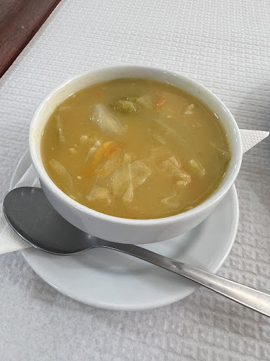 3.5 stars. Inexpensive, neighborhood, diner-type place. Simple, utilitarian, furniture and décor. Walls covered with local event posters and lottery advertising. Full bar with counter seating for eating, drinking, and buying scratch tickets. Plus a pastry case upfront with some delicious looking desserts. Wide ranging menu with Portuguese & Brazilian specialties, chicken, sausages, and veal amongst the dishes on offer. And the menu with sections in multiple languages. The prices were stunningly inexpensive. On our visit it was fairly busy and the servers were handling it all with a carefree and personable attitude. Also very helpful in making a decision. Today I chose seafood rissoles-shrimp in bechamel sauce-which were similar to a deep-fried empanada, served with rice & chips (fries). These were light on filling imo but were tasty. DW had a grilled chicken breast with mushrooms. This was as expected except for the canned mushrooms. Also served with rice & chips. Not high-end dining by any means but tasty, filling, and cheap but not memorable. As we spent time in the area over the next couple of days, we came to realize that this café is very popular, with tables full and waits on the sidewalk numerous times. Good, inexpensive, drinking...