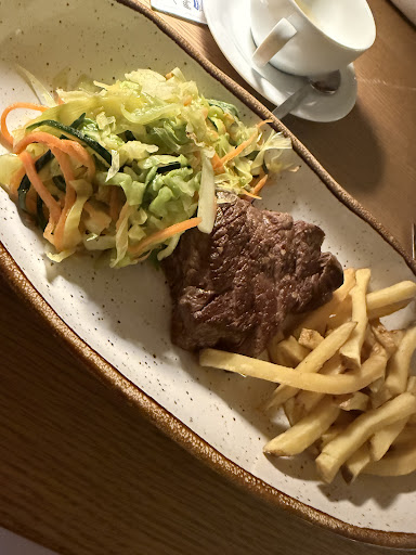 The place is well located and there is an outside space which is very pleasant, a very nice and elegant quiet ambience. The service was alright. Did not enjoy that much the food, the salad was wonderful (a bit greasy) but nevertheless wonderful. Meat overcooked for what I asked still tender, the taste nothing over the top. The fries, horrible, they seemed steamed instead of fried.