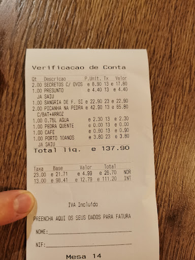 Read moreI recently visited this restaurant hoping for a good meal before leaving after more than two months in Portugal. Unfortunately, despite the cozy interior and warm greeting from an older gentleman who seemed to be the manager, the experience went downhill quickly.