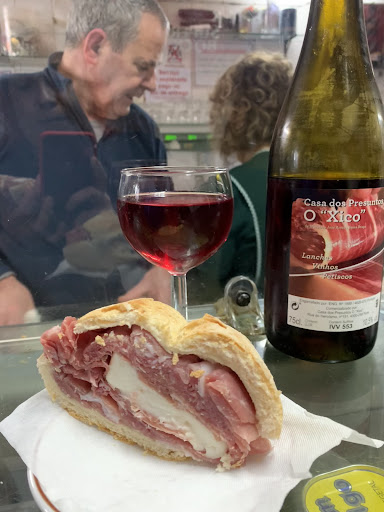 No, they don’t speak English, they speak Portuguese only. The “Mista” sandwich is 4€. They have tripes and other traditional dishes. It’s tiny inside. There is a frog statue. They have their own wine by the bottle. Super Bock on tap. Large jugs of white and red wine will be poured into smaller glasses if you don’t get a bottle of their house wine. Locals come and get to-go bags filled with sandwiches. The counter is filled with locals. I’m sure a few years back they smoked at the counter. “Xico” is family ran place. One more thing… it has soul. It belongs to the people of neighborhood . You’re in their living room. Thanks for having me and...