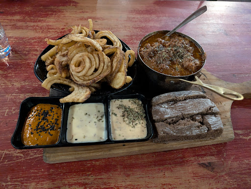 For food there's some tapas. They have galette too. The chips are nice and are spiral shaped. They come with three dips, which we liked. The stewed pork was lovely and warming on a Friday evening in early September when it was not warm outside.