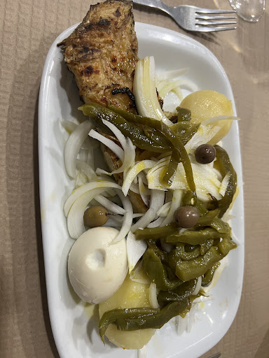 This place was horrendous. Would NOT recommend at all for various reasons. We wanted to relax and try Portuguese food on our vacation here but were very underwhelmed by the food and the service here. I'm actually surprised by all the good reviews this place has. Waiters are rude and look like they don't want to serve you nor be there. Their attitude is an absolute joke. We ordered the chicken and the tomato salad with fresh cheese. The chicken was dry and lacked seasoning. The tomatoes in the salad were not ripe either and again, lacked seasoning. Ordered chili sauce to go with the chicken and the condition of the bottle was disgustingly kept with sauce leaking out of the top.