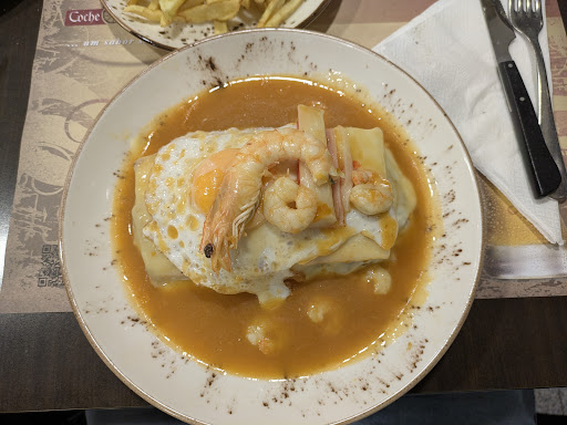 Read moreNo roteiro das Francesinhas, fui ao Coche Real, um dos restaurantes mais tradicionais e antigos da zona. O atendimento foi muito simpático e rápido, o ambiente estava bem limpo e iluminado. No que tange a Francesinha, leva o molho clássico do Porto com um leve trago a marisco, pouco equilibrado e saboroso, os enchidos eram bons, mas também eram em demasiado, a combinação de camarão com a francesinha não me caiu bem, mas isso é um gosto pessoal. O ovo veio no ponto ideal, o bife era de boa altura e tenro, ainda que pouco saboroso. No geral, acredito que é uma francesinha um pouco exagerada e com molho que falta um pouco mais de equilíbrio. Um ponto positivo são as batatas, caseirinhas ainda que um pouco oleadas. Recomendo à visita, mas sem muita...