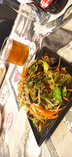 "Actually" the food was medium okay (anyone who has ever really eaten in Hanoi will be disappointed anyway). However, I found it completely unappetizing and inexcusable when the restaurant's own white dog ran out of the kitchen and was petted and fed behind the counter and he then scratched and jumped around. There was no subsequent hand washing at least! --- If I had seen this before eating, I would have left --- with all due respect, this is a hygienic no-go --- for eating: I was pleasantly surprised by the taste and preparation of the summer rolls with peanut sauce. When it came to the beef salad, however, I was very disappointed, as I assumed from what was shown on the menu and what was to be expected that you wouldn't just be served isolated chunks of beef in an otherwise standard salad. In the final noodle and vegetable soup, the chicken broth highlighted in the text was more of a watery substance. The green tea provided was equally weak, as there was no taste whatsoever and no recognizable leaves, let alone ground leaves. --- Hence a very cloudy conclusion, as on top of that there was no room atmosphere whatsoever, neither musically nor from any accessories....