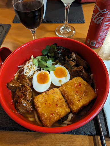 Unfortunately the high scoring for the place led us here looking for a nice ramen. The guys are very friendly there, the venue isn't the most cosy one, but I could live with it when the Ramen were good. We choosed gyozas and the vegan ramen with tofu. Gyozas were acceptable, but came with the standard globaly available sauce that comes with deep frosted asian food. We expected a homemade sauce, which you can do easily by using soy sauce and chili nixed with garlic. No big deal to prepare it. Alright we were hungry so may it be. But the ramen was not good. It was luke warm, besides some nori leafs and soy sprouts no vegetables and we got the impression that the base broth for the ramen was a meaty one. The card terminal was not working so we were lucky to have some cash. t's a bit sad, bc the guys were really nice and friendly, but I cannot recommend it. Maybe they had a bad...