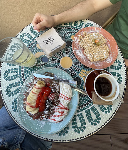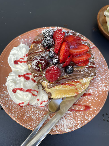 I tried to swap out the nutella on my pancakes for maple syrup - which shouldn’t be an issue because the two items are listed as of equivalent value under the extras section - I was told by the waitress that that would not be possible, and I’d have to buy the maple syrup at full cost if I wanted it. When I tried to ask why a swap wasn’t possible, I was met with an impatient “that’s just how the kitchen works here”, which was disappointing. How hard can it be to swap a sauce? Even McDonald’s can customise your order. I went for the original, which came drenched in way too much nutella for any balance. The coffee was also mediocre.