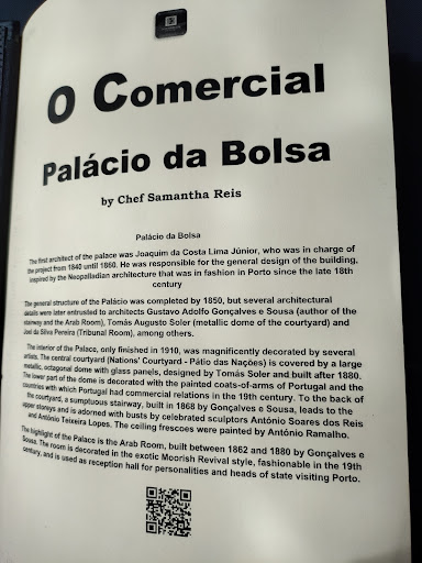 Read moreWe had a lovely lunch at Restaurante O Comercial in the Palácio de Bolsa, the famous palace and Porto chamber of commerce on a Saturday. It is a historic setting we had seen while visiting and not easy to get a booking. We began with fois gras, then my wife had the duck confit while I had the fillet mignon. For dessert we had the apple crumble and caramel petite gâteau. We had an excellent Alentejo red wine, the Olho de Mocho Reserva, and with the dessert a 20 year old tawny port. Service was stellar from Carmelo. We had a window table on a sunny day. We plan to return. On Saturday if you tour the palace, you can save your tickets with the QR code and get 30% off if ordering ala carte. No discount on the €20 M-F special that includes a starter, a main, a dessert, water, a glass of wine and bread. It is an excellent lunch in a...