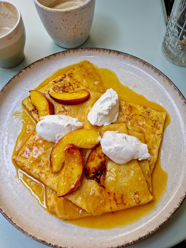 WHAT WE ORDERED: • Syrniki with lemon ganache, salted caramel and almond crumble - BEST syrniki I ate so far !! It went beautifully with the lemon flavor and salted caramel added on some sweetness • Crepes with caramelized orange sauce, cream cheese and peaches - very refreshing, perfect for summer; once again a nice contrast between sourness, sweetness and cream cheese to neutralize • Salted caramel latte - I liked this one even more than their classic cappuccino (which was delicious), even though I don't like sugary drinks - this had a hint of the caramel flavour, but wasn't excessively sweet