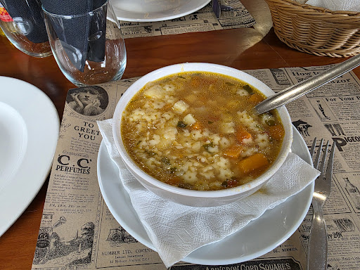 Serving staff completely ignored us at first, but once we had stood around for long enough, we were seated. Bit more of a culture thing, I think, coming from a professional kitchen myself. We ordered corzido for two, and my father ordered a soup of day with bread as well. Drinks took a bit to arrive, but after that, food was timely. Corzido was brought out first, a heaping portion, and when asked wgere our soup was, the server admitted he forgot, and brought it, then we asked for tge bread and hed forgotten it too. He was absolutely charming and sweet, I really enjoyed his easy smile and honesty, and it was a fond, fun experience, no trouble at all.