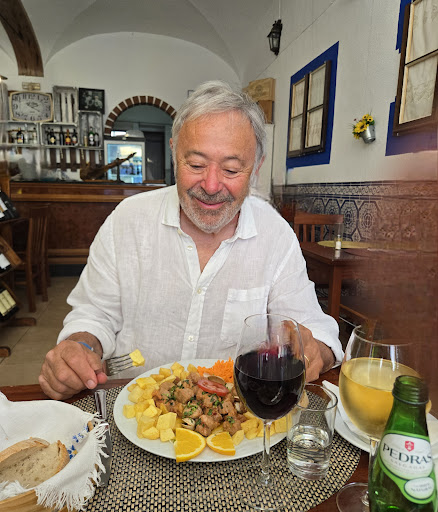 Nous flânions dans la chaleur de fin juillet dans la région de l'Alentejo, tout près de Reguengos de Monsaraz, célèbre pour son vin, à la recherche d'une banque (il est sage d'avoir de l'argent liquide dans ce coin incroyablement doux de la planète où la générosité est abondante). Les champs étaient d'un sable brûlé, couleur de chameau, et les oliviers, complètement inconscients à la chaleur, ponctuaient le paysage comme autant de parasols vert émeraude. Nous avons trouvé notre banque à Reguengos, dans un quartier blanchi à la chaux, très propre et calme, et soudain, nous avons reconnu l'heure et la faim de midi. Nous avons consulté des restaurants sur Google Maps et l'écran s'est éclairé de possibilités. Ce qui a attiré mon attention, ce sont les mots : O Barril « Cuisine typique, régionale et familiale, personnel aux petits soins… » J'ai vu une photo du carrelage bleu et blanc, une salle à manger offrant un havre de fraîcheur. Donc, nous nous sommes dirigés vers ce restaurant O Barril. Nous avons été rapidement installés dans une salle remplie de familles savourant leur déjeuner dominical. Les parfums, frais et vibrants, émanaient de la cuisine. Nous avons commandé un Porto 15 ans d'âge en apéritif. Paulo Grilo nous a recommandé des verres de vin de la région. Il nous a demandé si nous voulions du pain et nous avons répondu oui, mais pouvait-il aussi apporter de l'huile d'olive ? Bien sûr ! De l'eau pétillante fraîche a été servie avec le Porto et, peu de temps après (bien que le menu précise qu'il s'agit d'un restaurant slow food et que certains plats puissent prendre un peu de temps), nos plats sont arrivées. Le célèbre plat régional, la « carne de porco à alentejana », du porc aux palourdes (un délicieux mariage de saveurs) : un porc tendre et succulent, avec sa sauce subtile à la tomate et aux herbes, légèrement pimentée, et une grappe de palourdes, servi avec des pommes de terre légères et légèrement croustillantes au cœur crémeux, une généreuse salade de laitue, de fines tranches de tomates et de concombres, et de carottes râpées tendres, le tout assaisonné d'une vinaigrette à l'origan très parfumé local (j'en suis sûr), d'un vinaigre fabuleux et d'une juste dose d'huile d'olive. Frais, sucré, délicieux, le tout accompagné d'une "petite" portion de jambon pata negra fraîchement et magnifiquement coupé. La sélection de vins de Paulo était parfaite (il faut absolument goûter le Monsaraz reserva rouge) et les différents blancs régionaux aux notes vertes regorgent de pomme, de fleurs d'agrumes, d'agrumes, de poire… Chez O Barril, le service était d'un professionnalisme, d'une politesse et d'une gentillesse rafraîchissantes. Je suis retournée en cuisine pour remercier tout le monde et j'ai été présentée à la très jolie mère de Paulo, qui était également aux commandes. Je préfère garder le secret, mais découvrez le Portugal profond et sa cuisine authentique et poignante. Et surtout, n'oubliez pas d'ajouter O Barril à votre liste (attention à la marche...