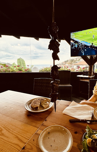 Fun concept of choosing your meat for the espetada skewers from the butcher and them cooking it on the open barbecue infront of you. Food tastes great and the skewers are hung from wire above all the tables and looks brilliant. The only thing we didn't like is that you have to cross the road (on a bend) to order food and drinks and wait for it to be brought over. There is a carro de sesta for photographs which is a nice touch and a ride on toy for the little kids. Our smaller kids had fun playing and the staff were kind to them which always makes me score higher than I might have done otherwise, for the following reason.... Communication needs work as we asked for my fiancé's birthday cake to be taken out of the box and brought to the table and then a different waitress came over, dumped the sealed box on the table and left. So he knew there was a cake in it for him and we had to struggle to get it out, unwrap the candles taped to the top and luckily we had our own lighter because they didn't offer to light them for us. Finally 5 minutes after it was put on the table we started to sing happy birthday! We also ordered coffees to come with the cake and by the time they'd arrived we'd eaten it... we had to chase them up aswell. And there were only 2 other tables eating at the time (to watch the football) so I'm not sure why they...