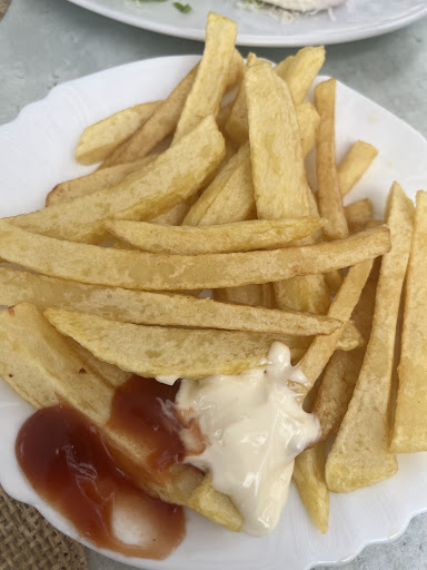 Read moreEndroit situé dans un passage, vue légère sur la mer. Notre serveuse était plutôt accueillante et parlait anglais contrairement au autres. Bruyant. Pour le repas, j'ai commandé un Burger chicken en avec supplément frite à 2,5e. Le Burger est amené sans salade comme demandé mais il n'a pas était goûtu. Aliment semble frais mais sans saveur, tout est juste posé dedans. Le poulet est une galette, hachée fait main avec des épices, elles ne se marient pas ensemble mais cela n'est pas non plus rebutant. Pain froid. Burger simple que l'on ferait à la maison. Frites basique, peu cher donc ok pour le prix. Sauces et sel/poivre à dispo. Je ne conseille pas forcément cette endroit si vous voulez vous régaler. Attente correcte. Adapté pour manger sur le pouce et prix raisonnable en fonction de ce que...
