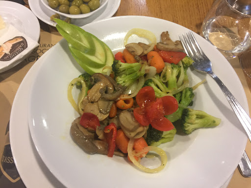 Here's what you do: you go to the restaurant. You don't waste your time with the menu. When the server comes, you describe your situation and throw yourself on the mercy of the chef, say you will eat whatever they can provide. You order appetizers of bread and olives. You ask for wine and (because you are American and Americans cannot seem to eat without it) water. Your companion orders steak.