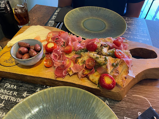 Nas fotos está uma tábua de entradas com várias coisas, muito boa, que se chama "Alapar e morfar", uma pizza "Pelo amor de Deus" com um toque incrível do pesto com as folhas de manjericão e a sobremesa divinal "Tenho uma pedra no sapato" (sobremesa generosa...