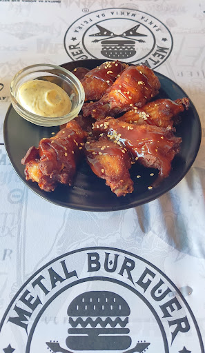 Excelente restaurante para apreciadores de metal e não só!! Ao entrarmos podemos logo apreciar vários posters e capas de álbuns de grandes bandas de metal, todo o ambiente bastante rock, bem decorado e com uma música ambiente selecionada ao detalhe para condizer com o espaço e nome. A comida é fantástica. Ótimas entradas, hambúrgueres divinais, em que o equilíbrio de sabores é bem notório. Para entradas escolhemos as asinhas de frango com molho barbecue, e estavam deliciosas. Para prato principal escolhemos o deep cheddar, perfeito para apreciadores de queijo, o cheddar vem servido á parte para podermos escolher a quantidade que queremos, e o cheddar é equilibrado e não se torna enjoativo. Escolhemos também o hambúrguer Kiss, em que o molho é a estrela do prato, em que a cebola é caramelizada em rum venezuelano, simplesmente fantástico. Não comemos sobremesa e optámos por um shot do tal Rum para podermos apreciar o seu sabor e não ficámos nada arrependidos. De sabor amadeirado, mas suave, foi o fim perfeito para a nossa refeição. Sem dúvida que se estivermos na zona, o Metal Burguer é paragem obrigatória. Uma sugestão, terem hidromel seria uma boa bebida para acompanhar e bastante dentro do...