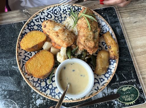 I eat mostly plant-based, so I got the vegetarian skewer (which I expected to be vegetables, but it was actually a vegan meat substitute - I probably could have asked what it was but I didn't think to based on the menu listing). My husband got the Portuguese style chicken with potatoes and vegetables. He said the chicken was very good but under-seasoned and thought the gravy was as well.