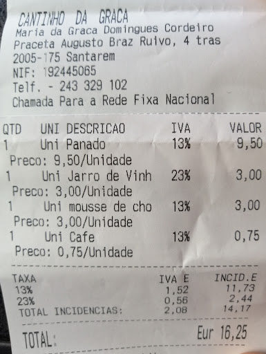 Localizado perto do Continente de Santarém, o Cantinho da Graça é encantador, o ambiente é extremamente agradável, o atendimento é excelente, as meninas são muito educadas e atenciosas, a decoração é linda, muitos objetos que boa remetem a infância e a nossa adolescência, mesas decoradas com diversas notas de dinheiro de vários países, e para fechar com chave de ouro, a comida é ótima e tem um preço muito bom, sempre que vou a Santarém é lá que faço meu lanche, ambiente para ir com amigos e com a família, vale a...