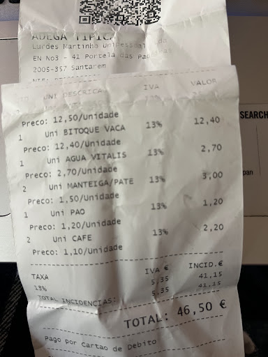 O menu incluía bebida, pão, azeitonas, uma bebida, sobremesa e café. Paguei o que está na fatura, era apenas uma água de 1,5lt para 3 pessoas! 2,70€!! Bitoque péssimo um pequeno bife debaixo do ovo estrelado, batatas e um pouco de arroz numa travessa de alumínio, mesmo rasca!!!