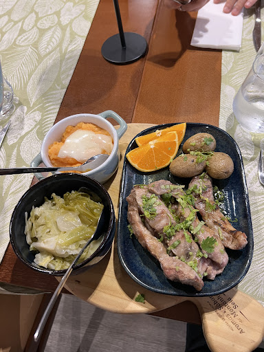 Sorpresa sorpresa, según entras ya vas viendo el ambiente, bien reformado, con muchísimos detalles que para mí son importantes como la cestita del pan, el recipiente para servir el vino, la música de fondo que invita a relajarte y le dan ese toque...diferente. Sorpresa; mi plato era típico de aquí Bitoque a la portuguesa y consistía en un bistec con un huevo frito encima sobre una especie de sopa de vino y patatas aparte, por no preguntar, pero estaba delicioso, un sabor diferente, por ponerle pegas...al cortar es difícil al no ver mucho el bistec. Bacalhau con verduras por encima, buenísimo ya que llevaba pan de boroa(mi favorito) y el postre que al entrar fue el primero que vi, una mousse de cheesecake, realmente deliciosa y que yo hubiera tomado un pelín más fría, pero espectacular, abundante y sobre todo en un muy muy...