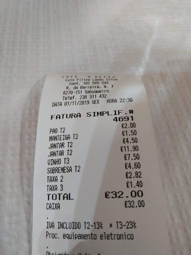 Read moreEstacionei junto ao restaurante, com o intuito de almoçar com a família. No entanto como era cedo, resolvemos ir a uma loja de casacos de pele antes de irmos almoçar. O dono do restaurante, vendo que nos afastamos apareceu interpelando nos de uma forma muito mal educada, que não podíamos estacionar naquele local por pertencer ao restaurante. Isso já nós sabíamos. No Sabugueiro funciona assim em todos os estabelecimentos (nada a criticar por esse motivo).. Perdeu nesse momento seis clientes decididos a entrar. Não sabendo qual a qualidade da comida, visto não ter entrado no local, dou nota completamente negativa, pela a falta...