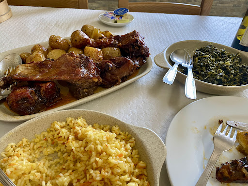 Sentamo-nos, pedimos as coisas. Vieram sopas. Ainda havia pessoas a comer a sopa (que tinha chegado minutos antes) e já estavam a atolhar a mesa com os pratos pedidos. Gestão da cozinha: zero! As carnes embora fossem agradáveis e bem temperadas, eram todas acompanhadas por umas batatas meio cozidas meio assadas, sem paladar nenhum. Faço batatas assadas bem melhores, e sou de longe expert na matéria. Veio também arroz, esse menos mau, mas vinha pouco quente, sinal de arroz aquecido e não feito na hora.
