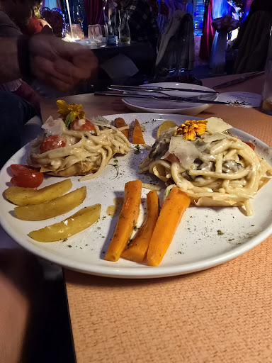 The restaurant looks amazing. Great ambience. Unique and interesting decor. The red sangria is watered down. The non alcoholic mango margarita is mango juice and crushed ice. The poncha was good. Couvert: a bun, sliced into 5. A tiny bit of butter with a little bit of olive oil and balsamic. boring. Amuse bouche: a half macaroon with a dollop of source cream and a half cherry tomatoe. Well presented. Tastes good. Mains: I ordered a pastry pasta, fairly flavourful. I could have made better at home. Ice cold cooked apple slices. Ice cold caramelised carrot. The other 2 plates were cold when they arrived 7 minutes later. eggs cold, meat cold. 11 minutes after that the last plate arrived. The waiter blamed the delay on the plates on us because we were late. But I was watching the other tables orders and the same delay was happening. Overall, I would not recommend this place, however, the decor...