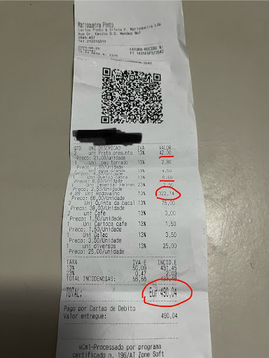 Read moreFood is ok. What is not ok is the price and service. Without ordering it they bring 2 dishes of presunto and cheese, worth €50 euros (42 + 6.5). One thing is bringing an appetizer worth €5-10, other is trying to squeeze in a €50 charge without asking the customer. Furthermore, the waiter recommended us to order rodabalho (turbot) for 5 which wasn’t on the menu. Price was €350 (322 + 25 for sides). €70 per person for a plate of turbot that was ok, nothing spectacular (a bit gummy); even if it was spectacular the price would be outrageously expensive. You can get a dish of outstanding turbot, even in top restaurants in Madrid, Lisbon or Paris, for €30-40 (O Pazo in Madrid, tier 1 Fish restaurant in Spain, outstanding quality it’s €38). These guys charge €70 for a plate of ok fish in Seixal. Can only call it a rip off. Total was €100/person....