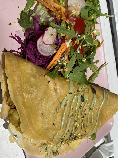 The crepe is served with fried sweet potato (with dipping sauce) or salad. There's now also "vegan chorizo bread" - ask for it!