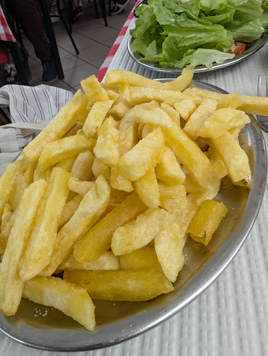 Devo concordar que, apesar de não ter maneira de comparar, estava de facto muito bom. Havia uma ou outra peça mais rijinha e difícil de mastigar (meio "chewy"), mas no geral o choco era bastante suave e bem confeccionado. A dose (17€) dá para dois adultos à vontade, e depois pedimos uma dose de batatas fritas (paga à parte; a 3,75€) e uma dose de salada de alface e tomate (também 3,75€).