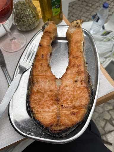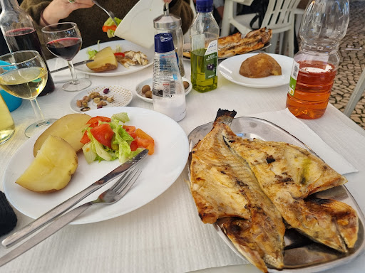 Read moreSe você procura comer peixe fresco na brasa, com um bom atendimento e custo benefício, está no lugar certo! Fomos prontamente atendidos pela Tânia, muito simpática e solícita. Nós comemos o menu da semana com peixes Você pode escolher o menu da semana que é composto de: uma carne, peixe ou frango com direito a salada, bebida e sobremesa. Os peixes da foto são um robalo e um dourado. Todos os 2 estavam deliciosos e acompanhados de batata cozida super quente. Perfeito para acompanhar foram os vinhos da casa que estava embutido no menu e por sinal vem em garrafa! O preço? Um espetáculo a parte, apenas 11 euros cada por esse menu completo! E de quebra comemos o quindim de sobremesa que estava maravilhoso! O local é cercado de locais, então não se espante com sua simplicidade, o sabor é surpreendente e muito bom!...