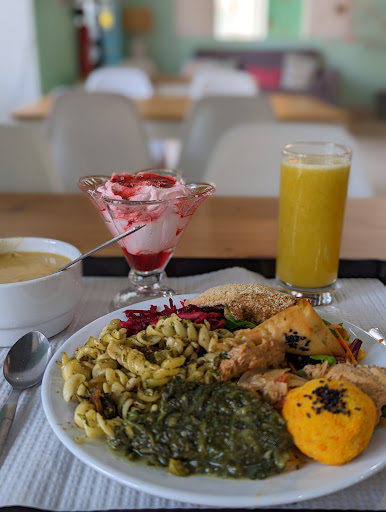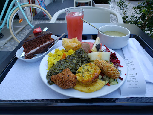 If you are a meat eater that I usually am, you may have to change your perspective. I came to eat food that taste fresh and also felt good to my body during and after I digested it. I order the complete set where I got to pick one plate buffet style of all the choices on the bottom level of the cafeteria trays, 4 small pastries, 1 fresh juice, 1 soup of the day and 1 dessert. The food was more than enough. I barely finished the food. The soup was good to eat with the pastries, but the filo pastry with berry compote tasted the best out of my selection. The beet apple salad was memorable. The other foods were tasty/ filling but not very memorable. The chocolate cake was delicious! I had trouble finishing it after all the food I ate, so I enlisted the help of an espresso to balance out the sweetness and speed up my digestion. I was very full, but did not feel tired after eating...