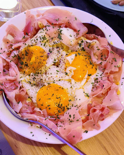 Em relação ao nosso pedido desta vez, foi 1 desastre, desde 1 esfregão de aço nas batatas fritas dos ovos rotos, como que a desconfiarem... UFA lá viram que tinham mais fios de aço agarrados à frigideira das batatas. Um pequeno papel com letras minúsculas também vinha agarrado ao presunto do mesmo prato. Os sumos de laranja naturais com mosquitos e pequenos objetos pretos que expliquei delicadamente que poderiam lavar primeiro as laranjas, a senhora indicou: nada a fazer, sabe é de começarmos logo a fazer sumos cedo 😏😬 levantamo nos de imediato!!