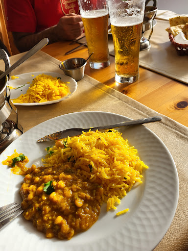 Read moreA little hard to spot as it is up a set of stairs on the first floor and signage is easy to pass. Once in there it is clean, open, airy and simply decorated. They serve alcohol and take electronic payment. We were only interested in the Indian food but the menu was vast with offerings from all over the world. There are 2 pages of vegetarian dishes. We asked about the vegan options. They have prepared a separate vegan menu but you have to ask for it. We asked if the onion bhaji was cooked in same oil as the chicken and they said yes. Be aware of this however Ricki the server said they would cook it separately if we wanted. Very grateful for this kind attention! The bhaji was too pasty (moist) in the middle for our liking but was tasty nonetheless. I chose Tarka Dal made with yellow split peas and it was superb. My partner had spicy fish masala (recommended by Ricki) which he loved (it's hard to get curried fish here). He ordered garlic naan and we loved the garlic rice. There is only naan on the bread menu. With poppadums and 2 canecas of Heineken just under €40. Ricki's service was pleasant and helpful and in English! A strange location but totally...