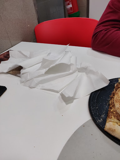 Read moreAtendimento péssimo, ao ponto de colocaram guardanapos na mesa da forma que a foto mostra de seguida... pedidos por nós mas se calhar tinha sido melhor trazer de casa... Dp, fomos experimentar a pizza de chocolate, Vulcano, p comer na loja, puseram-na na caixa, vieram ao balcão dizer que estava pronta respondi que era p comer ali, foram, c péssimos maus modos, colocá-la num prato, não explicando a forma cm deve ser comida, ou seja, as laterais são p molhar no centro, cm era a 1a vez não sabíamos... De qualquer modo, cm c tudo isto a pizza já estava fria. Foi realmente uma compra q mals valia ter ido ao supermercado e comprar uma de lá só p não ir à Lj Telepizza Setúbal incomodar as pessoas... Foi claramente c essa sensação que saímos de lá... A...