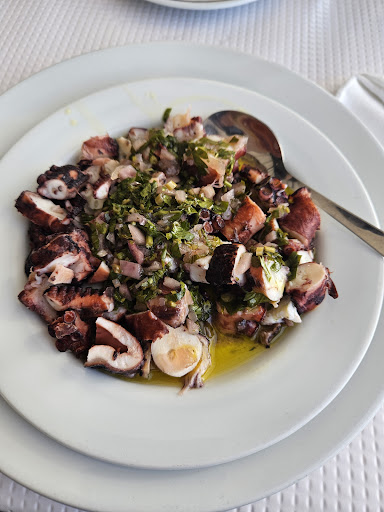 Read moreLocated right on the beach, that was the best part! They had outdoor area but it was not open due to occasional rain. It was sunny the whole time o was there! I will say the seafood was excellent. The rest, meh. I got the octopus salad, and it was a good portion, so I took the leftovers with me and snacked on them later. For the main dish, I got tuna belly steak. You actually tell them how much you want by grams because it's priced by kilo. That was excellent! It was a lot of food ( I ordered 200g, which is about 6oz), and it was crusted with coarse salt, pink on the inside, and very flavorful. I wish it wouldn't end! But I was stuffed! I couldn't manage to touch the sides, which were boiled potatoes and a garden salad. All in all, my advice is to go hungry, order seafood, especially fish,...