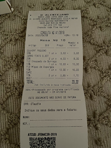 The menu is great as is truly authentic food from Alentejo which that’s what made us come, we had the olives and rockeford cheese as a starter and was great, we ordered then the migas com entrecosto and the carne a alentejana and was the best I have ever tried made properly full of taste it was just amazing.