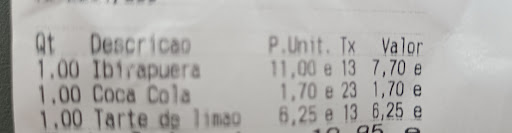 Read moreFui almoçar hoje e pedi um hambúrguer e uma coca cola, estavam ok. Quando fui pedir o cardápio para ver a sobremesa o atendente me disse que não estava no cardápio pois não estava atualizado, ok, então ele me disse as opções e escolhi a tarde de Limão. Quando a tarde chegou a mesa ela estava CONGELADA, não fria e sim congelada, nunca tinha visto isso, achei estranho e quando provei vi que além de congelada estava amarga, não azeda do limão e sim AMARGA. Um funcionário disse que tinha que esperar alguns minutos, sei que ele tentou ser simpático mas imagina que pagar 6,25€ por torta congelada, é melhor pagar 5€ na do Lidl que é congelada também e maior. De início achei estranho, falar que as sobremesas não estão no cardápio, depois que vi o valor, percebi o porque não estava. Então se forem, não aconselho pegar a sobremesa, na verdade nem comi, paguei mas não comi, CONGELADA,RUIM E CARA. E se forem comer lá perguntem o valor antes e vejam se vale a pena ou não. Uma outra funcionária perguntou se não queria levar, sei que ela tentou ser agradável, mas não tem como,...