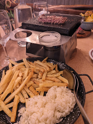 Read moreEste restaurante chamou-me a atenção porque apresenta carne maturada no menu. Antes de tudo, o serviço é profissional, a carne apresentada estava dentro das espectativas, mas... Vou explicar os "mas": Escolhi uma peça frisia das Asturias, e é aqui que começa o primeiro "mas" a carne é grelhada na mesa, numa pedra aquecida e pelos próprios, o conceito é que cada um gosta da carne no seu ponto, e se for o próprio a cozinhar não tem como falhar. Compreendo o conceito, porem, a pedra não mantem a temperatura, embora tenha sido trocada quando já estava fria. A frisia, devido à peça que é tem alguma gordura, a pedra na mesa com a gordura salpica por tudo o que é sitio, fiquei com umas pintinhas na t-shirt que estava a usar e com o avançar do tempo e com a gordura que a pedra acumulou, alguns dos bocados mais pareciam fritos que grelhados. Mais uma vez, compreendo o conceito, mas seria muito mais agradável que a peça fosse assada no carvão e no ponto desejado pelo cliente (com um assador que perceba do tema não há como enganar) e viesse fatiada para a mesa. Uma vez que a confeção da carne é feita na mesa, não compreendo a demora (mais de 30m) entre o pedido e o tempo de chegada da comida à mesa. O restaurante estava menos de meio (no que à lotação diz respeito) e os acompanhamentos (esparregado, batatas fritas e arroz) não justificam a demora. Espero que recebam esta critica de uma forma construtiva porque o objetivo é ajudar a melhorar. Até...