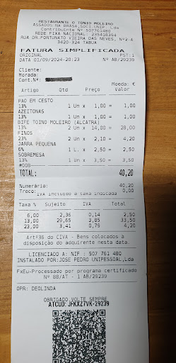 Então por onde começar, liguei por volta das 19H45 a perguntar o que tinham e me foi dito que fazia TUDO porque era tudo a base de churrascos. Reservamos para as 20H30 e lá fomos, quando chegamos vimos logo a cara do senhor que faz a carne que não gostou muito da ideia de trazermos um carinho de bebé, assentamos nos duas mesas depois da entrada em frente a caixa muito importante esse detalhe. Encomendamos 3 pratos de carne de peru onde nós foi dito que não era possível porque só haviam 2, então uma colega escolheu o famoso nacro de vitela.. a senhora voltou e disse que afinal não havia nenhuma carne de peru e que havia um preto de carne de porco e nós disse « escolham um nacro de vitala muito bom » nós não comemos carne de vitela então escolhemos a opção de porco mas como so havia 1 a minha mãe abdicou da carne dela e eu partilhei um pouco com ela depois. A minha colega queria a carne bem passada e a senhora disse nós que era melhor mal passada, então foi assim até pq não tínhamos muita opção né .. comemos 1 queijo fundido que nos foi dps cobramos 1,20€ ? por esse preço comprava literalmente uma caixa de vários mas prontos, as migas tinham um sabor estranho e a carne foi lavada em sal, quase que saía de lá com o cholesterol. As batatas e o arroz elas estavam comestíveis. En questão ao detalhe sobre nós estarmos perto da mesa tivemos a oportunidade de ouvir uma senhora a dizer que a carne não estava boa e a patroa disse « impossível a nossa carne e a melhor, e a vitela é nossa especialidade » a senhora acabou por dizer que tinha especialidade com a carne e que aquela não era boa. Na hora do pagamento um senhor disse a patroa que as migas tinham sabor ao assedo e quando lhe dizemos que tínhamos ouvido ele dise que estava a gozar. Pagamos 34€ por 1 fatia de broa (1€) um pacote de 25g de queijo fundido (1,20€) um nacro de vitela que não sei bem o preço,uma carne de porco, uma porção de migas (com sabor a todo menos migas) arroz e batatas fritas. Sem flr da patroa que ainda puxou o carinho de bebé da minha filha para ver A MINHA BEBÉ que ela não conhecia de lado nenhum. enfim não liguem as fotos no facebook com famosos e não vão lá comer a não ser que queiram comer oq a...