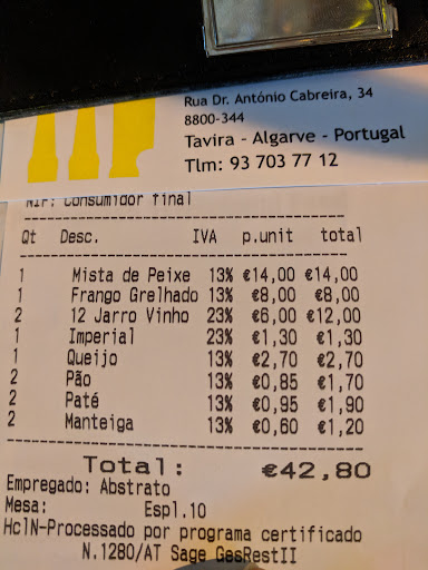 Read moreThere are so many places to eat in season in Tavira, it can be difficult to choose! We chose wisely here. Courteous and positive staff able to make menu suggestions in English French and German (from what we heard). Indoor and outdoor seating. Reasonably priced Portugese cuisine, steak and cod fish around €15. Pleasant wine, smooth coffee. Can't account for deserts as we were too full to try. First time trying the local cod fish. Moist and very meaty. My companions both had steak and really enjoyed them. As I say we were all stuffed. Starter of olives, three mains, litre of water, two glasses of wine and coffees came to €52, which I found very reasonable for such a...