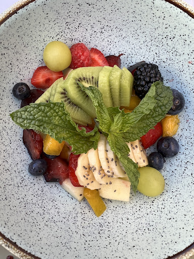 The fruit bowl, often an overlooked side, is full of a variety of perfectly ripe fruits, tangy kiwi, sweet strawberries alongside blackberries, raspberries, peaches, grapes and apples, oh my!