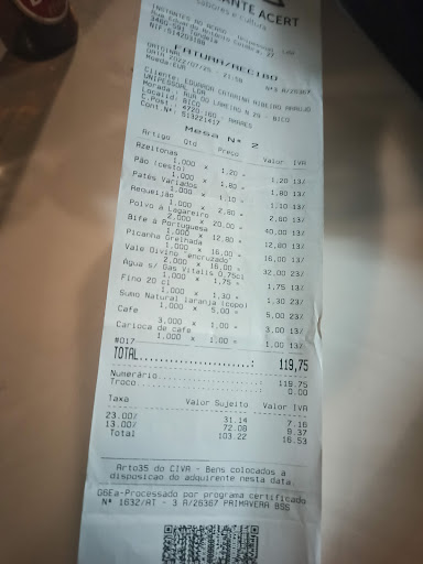 Read moreMuito mau! Perderam um cliente pelo atrevimento do patrão ou gerente! Sou de Braga e cliente por intermédio do cliente local e sempre tive um serviço de excelência pelo funcionário Daniel. Hoje, lamentavelmente, fui servido pelo patrão ou gerente e... fui ofendido pela ousadia que tiveram aquando da apresentação da conta... . para não dizer pior.. Paguei e só depois fui reclamar... Fomos 4 trabalhadores e pedimos: Meia dose de picanha: 11€ - cobraram 16€ Um bife á Portuguesa : 12,80€ - cobraram 12,80€ Uma dose de polvo á lagareiro para duas pessoas : 20h - cobraram 40€ dizendo que serviram duas doses... Sério?????? Não somos Turistas... Somos apenas 4 trabalhadores portugueses que foram lá jantar..... Como em diversas...