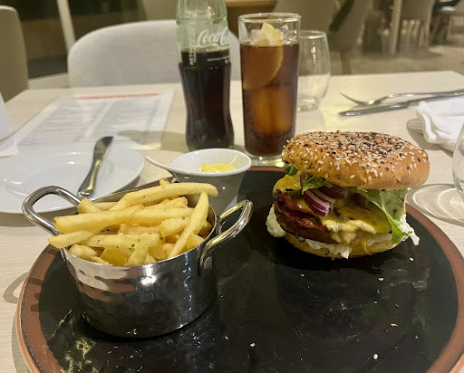 Una hamburguesa minúscula, como se puede ver en la foto que adjunto, por 19€, dos Coca-Colas a 4€ cada una y una bola de helado por 4€ ….. en total 35€ y me fui con hambre.