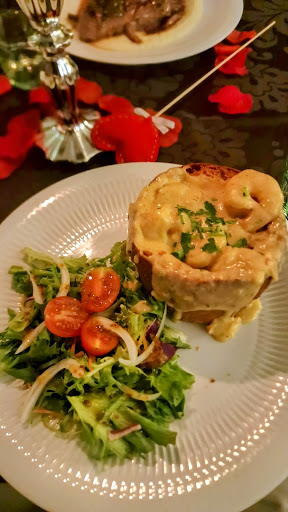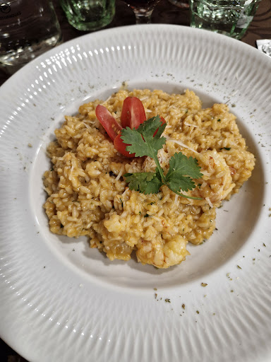 En cuanto a la comida, simplemente espectacular. Probé un plato con camarones, cuyo nombre no recuerdo, pero lo que sí tengo claro es que fue una explosión de sabores intensos y bien equilibrados. Mi esposa eligió un bistec con puré de papas y champiñones, bañados en una deliciosa salsa. Cada bocado era una experiencia exquisita.