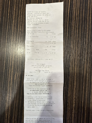 Most overpriced pizza ever! €17 for a little “medium” which was easily an individual in all over the world. No tomato spice, lots of cheese, some ham and a few olives. Really? When we arrived the place was empty and the employee gave to us the worst table! All the place empty and we could easily sit better. At the end the employee gave us a better table. Very slow to deliver a little “medium” pizza. God sake the price… Second time in my life in Pizza Hut....